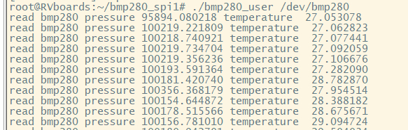User layer test program: bmp280_user.c Compile and execute: 1、Copy bmp280_user.c to the development board 2、Execute gcc -o bmp280_user bmp280_user.c to compile and generate bmp280_user execution program 3、Test command: ./bmp280_user /dev/bmp280