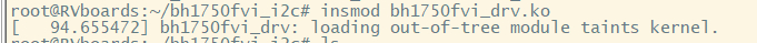 Source code path: driver_210519 bh1750fvi_i2c Powering code:bh1750fvi_drv.c Compiler: 1、Copy "driver_210519 bh1750fvi_i2c" to the "lichee" directory in tina-d1 sdk 2、Enter bh1750fvi_i2c and execute the "make" command to generate the bh1750fvi_drv.ko file 3、Copy to the development board, execute insmod bh1750fvi_drv.ko, load the driver module, as shown below