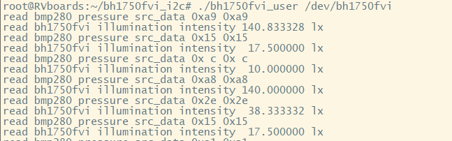 User level test procedure:bh1750fvi_user.c Compile and execute: 1、Copy bh1750fvi_user.c to the development board 2、Execute gcc -o bh1750fvi_user bh1750fvi_user.c to compile and generate bh1750fvi_user execution program 3、Test command:./ bh1750fvi_user /dev/bh1750fvi