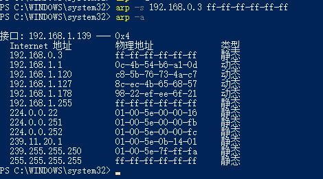 4:In the DOS command window to bind the IP address and MAC address of the development board, (because the test project does not support ARP protocol, so only through this IP and MAC binding to force the development board IP address and MAC address associated together, so that when the PC sends a packet to 192.168.0.3, the target MAC address is automatically the development board's (MAC address.) Run the command:arp - s 192.168.0.3 ff-ff-ff-ff-ff-ff View command:arp -a