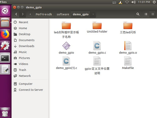 Compile and download the c program. Select demo Open the configured virtual machine, and open the directory /home/a/desktop/1/sirv-e-sdk/software/demo_gpio Copy demo_gpio.from the file "three color led blinking" to the above directory. As shown in the figure below