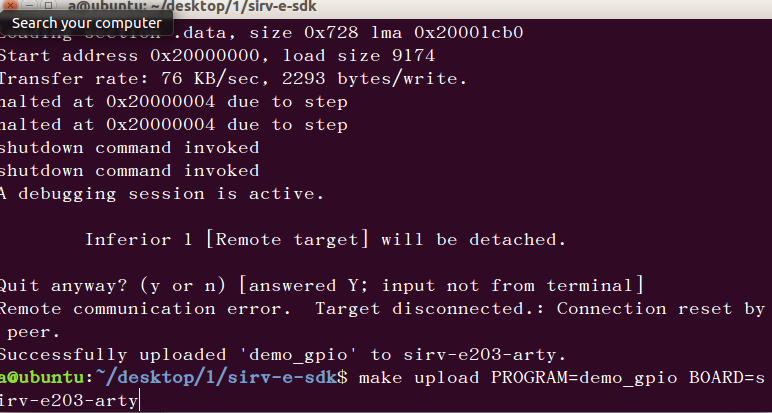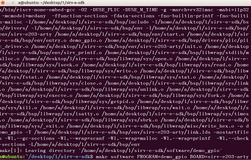 Open the directory /home/a/desktop/1/sirv-e-sdk Compile the target file: open a terminal in the directory and type make upload PROGRAM=demo_gpio BOARD=sirv-e203-arty As shown in the figure: