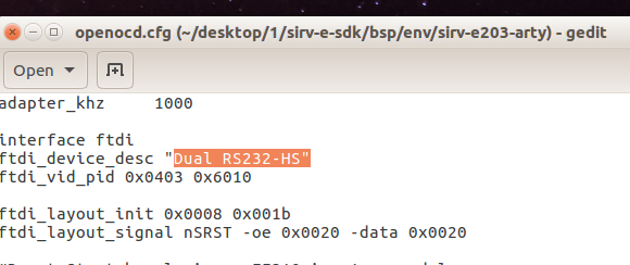 then it may be that the device name needs to be changed. Open the directory /home/a/desktop/1/sirv-e-sdk/bsp/env/sirv-e203-arty and open the file shown below.