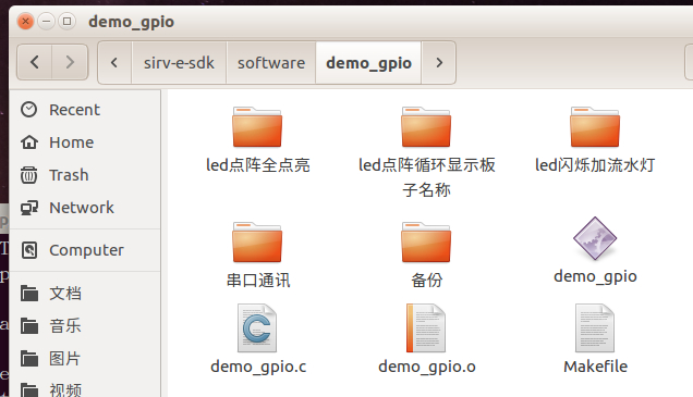 Compile and download the c program. Select demo Open the configured virtual machine, and open the directory /home/a/desktop/1/sirv-e-sdk/software/demo_gpio Copy demo_gpio. from the file "led dot matrix cyclic display board name" to the above directory. As shown in the figure below