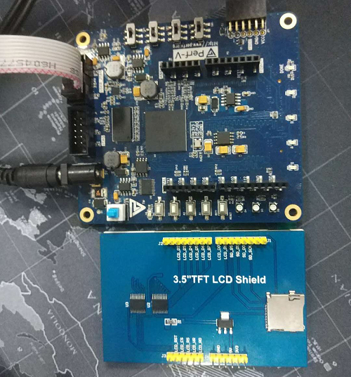 - Specific requirements:Display the specified content through Hummingbird TFT screen. - Experimental process: 1、 Open the configured virtual machine, copy the .c, .h and Makefle files in the TFT folder to the directory in the above experiment: /home/a/desktop/1/sirv-e-sdk/software/demo_gpio 2、 connect the JTAG downloader and the computer, the JTAG downloader and the development board, and plug the screen into the development board, as shown below.