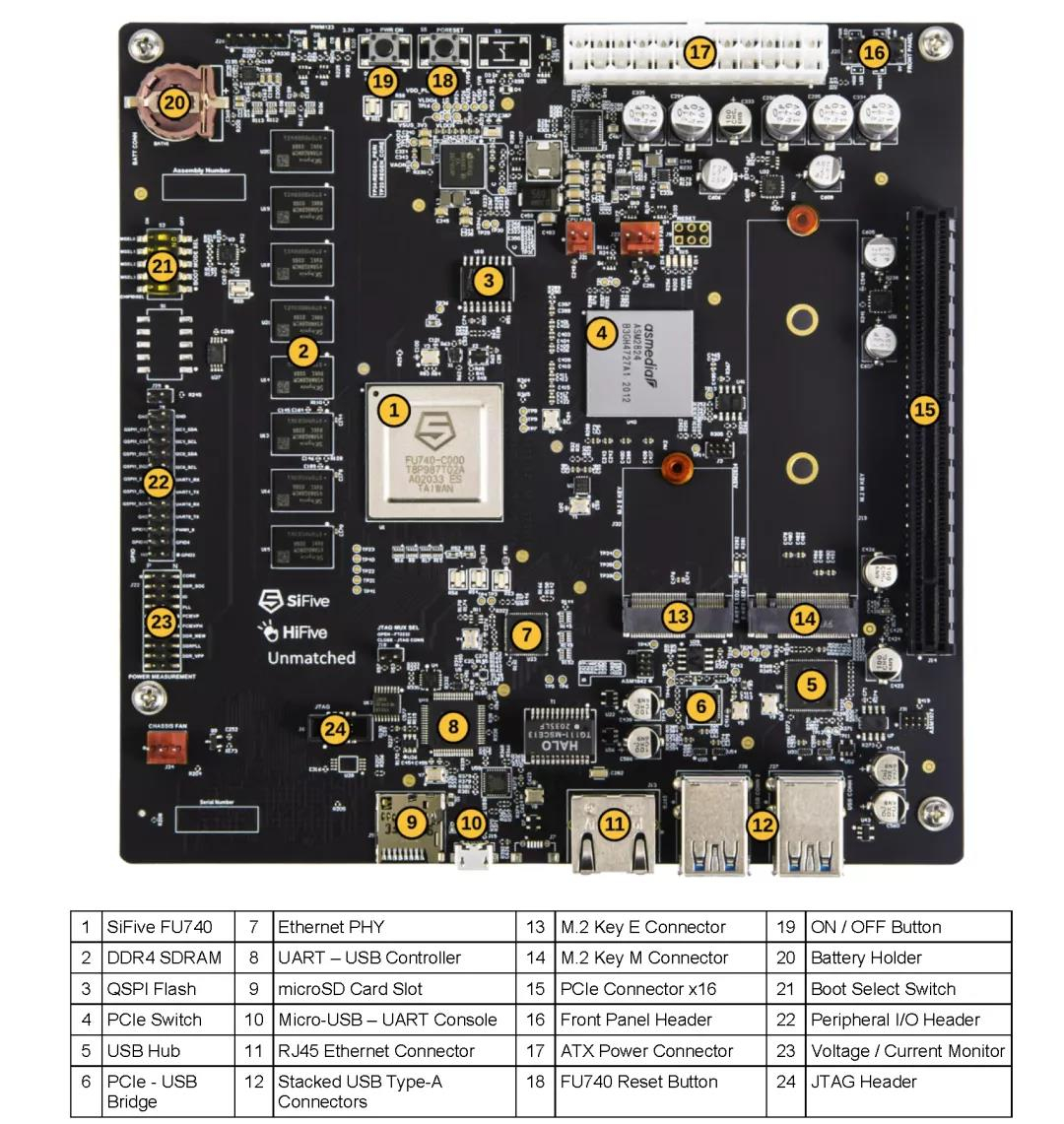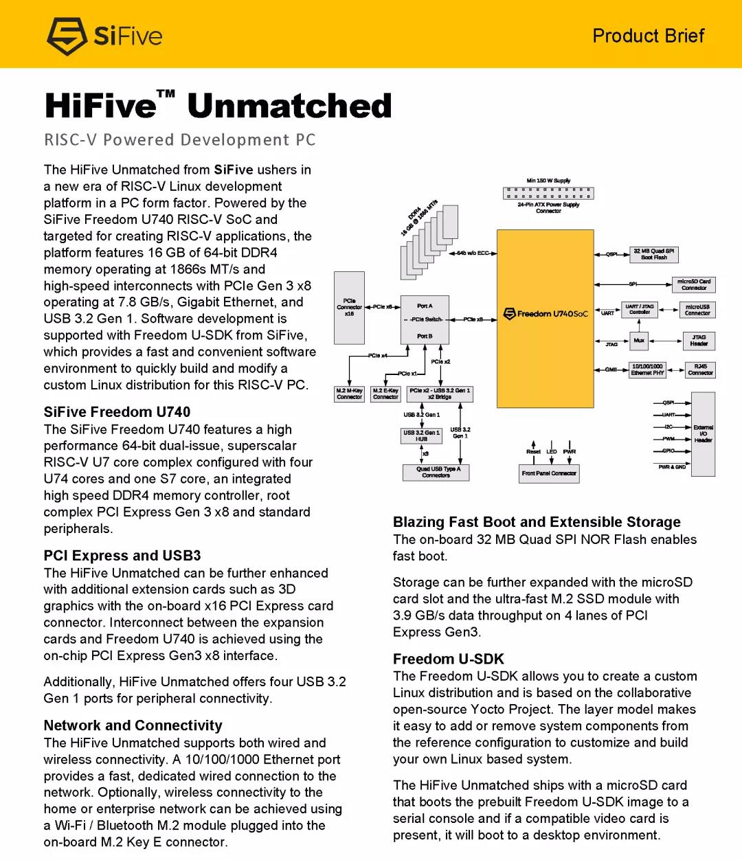 The HiFive Unmatched integrates five RISC-V cores (four U74 application processor cores and one S7 embedded processor core). On board are 16GB DDR4 and 32MB SPI flash chips, 4 x USB 3.2 Gen 1 ports, a PCI Express x16 slot (x8 rate), an NVMe M.2 slot, microSD card reader, and Gigabit Ethernet. HiFive Unmatched is a Linux RISC-V PC platform for RISC-V developers (although not perfect) and developers can easily use HiFive Unmatched to create the RISC-V based software they need for RISC-V platforms - from real-time operating systems to custom Linux distributions, as well as compilers, libraries and applications to accompany product designs, and can also perform native testing and RISC-V code builds based on HiFive Unmatched.