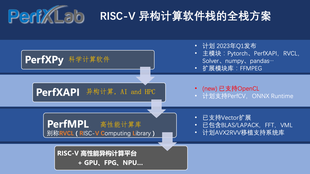 PerfXLab is committed to accelerating the development of basic software for computing. Help the industry get rid of proprietary programming models, achieve efficient and agile development of accelerated computing, and realize the value of all innovative computing hardware. The R&D team also continues to invest resources in RISC-V software ecology, with the goal of building a heterogeneous computing software stack full stack solution for RISC-V system (from mathematical computing library, heterogeneous computing framework to scientific computing software).